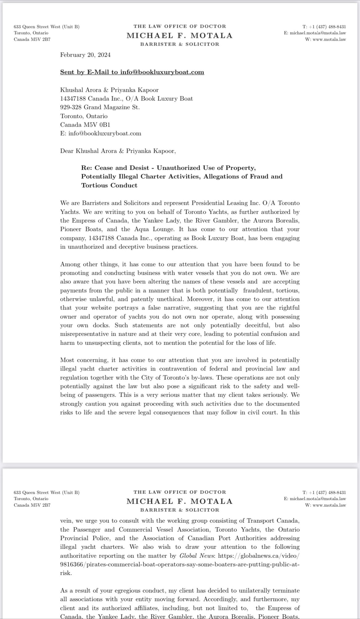 BookLuxuryBoat.com operating under the name Book Luxury Boat is a company owned by Khushal Arora and Priyanka Kapoor. the only issue is the company does not exist and the actual company accepting payment is 14347188 CANADA Inc.